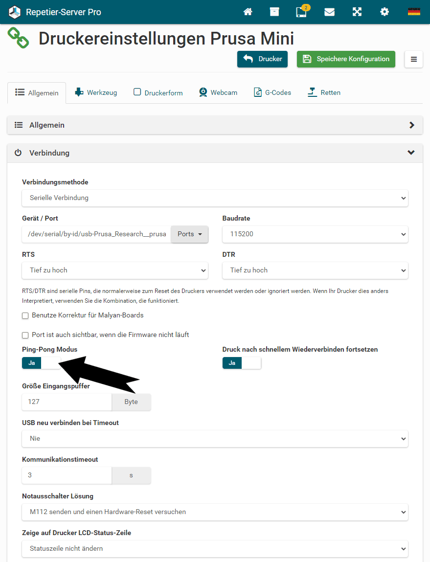 Für den Prusa Mini/Mini+ musst du den Ping-Pong Modus in den DruckerEinstellungen Allgemein Verbindung oder im Installationsassistenten aktivieren. Bei der Verwendung paralleler Befehle gerät die Firmware irgendwann aus dem Takt, was zu einer verzögerten Ausführung der Befehle führt.
